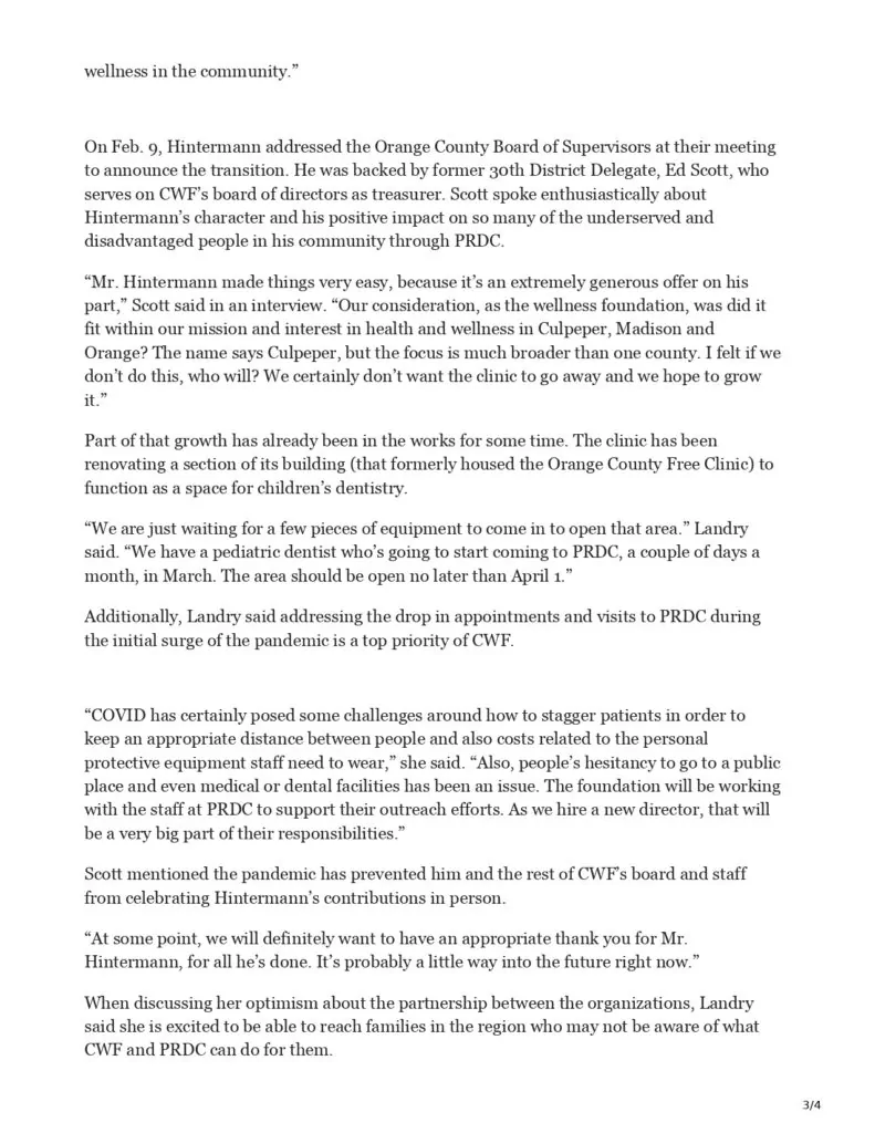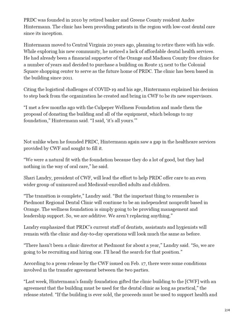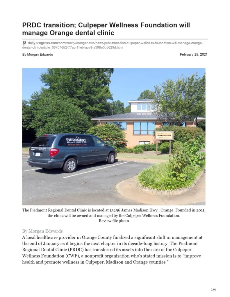 PRDC transition; Culpeper Wellness Foundation will manage Orange dental clinic